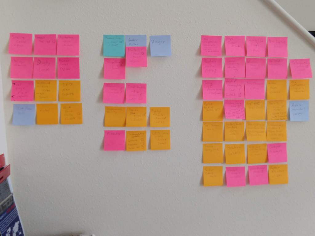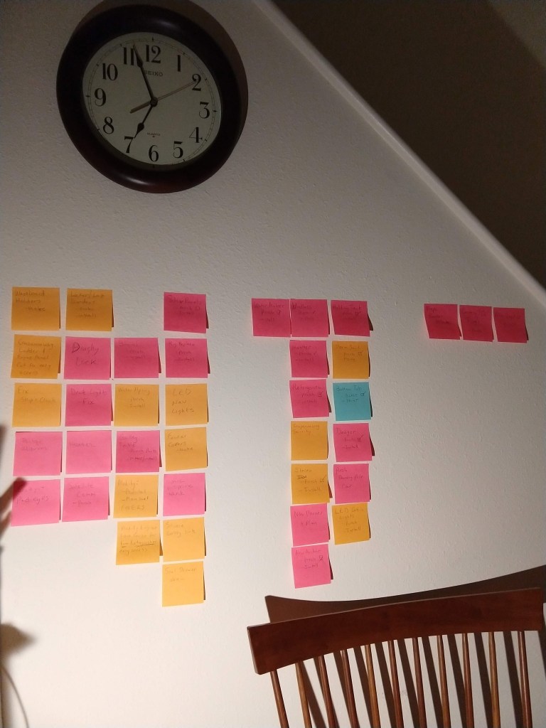 I’ve mentioned already some of the work we’ve already completed and what’s left, but I may be repeating here that every day usually shows some accomplishment, thus providing more appreciation that we’re moving in the right direction. We celebrate the end of a day with cold malt beverage or glass of wine, as we ceremoniously move one or more notes from left to right. (While not taken with great care and consistency, you can see a basic time-lapse series of photos, starting from early March to present at this link). At first the movement was painfully slow, but has slowly gained momentum (and motivation). Key to colors and columns:
