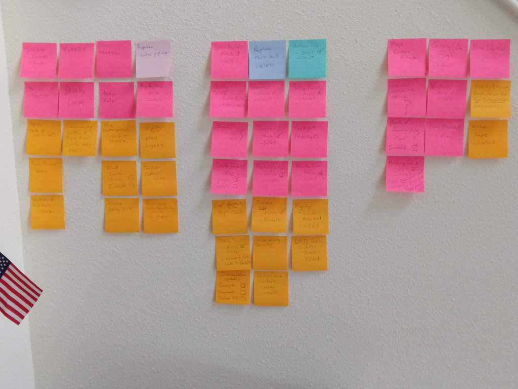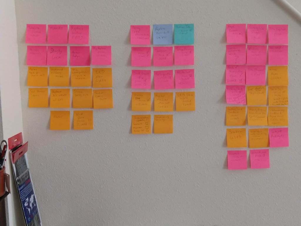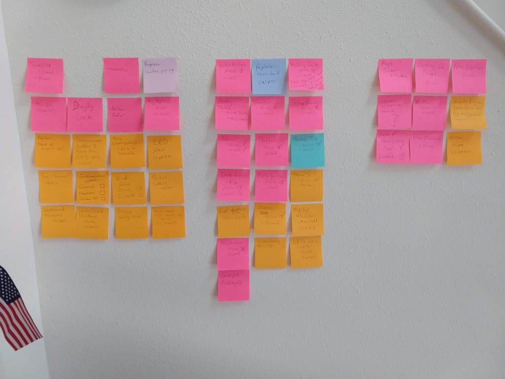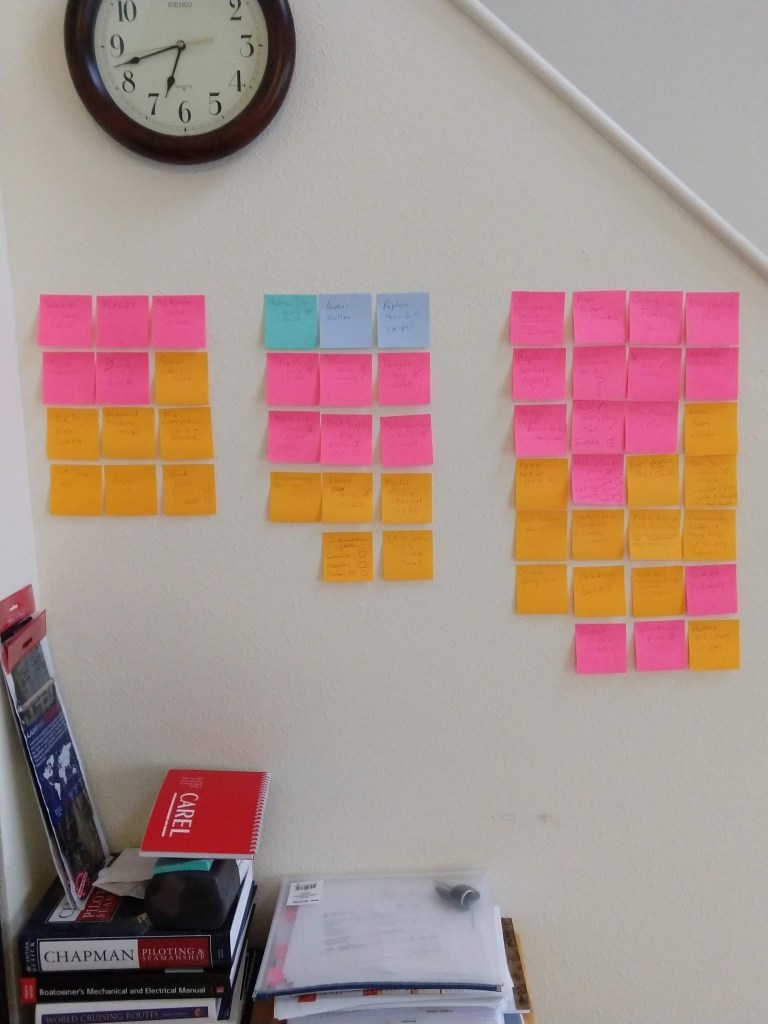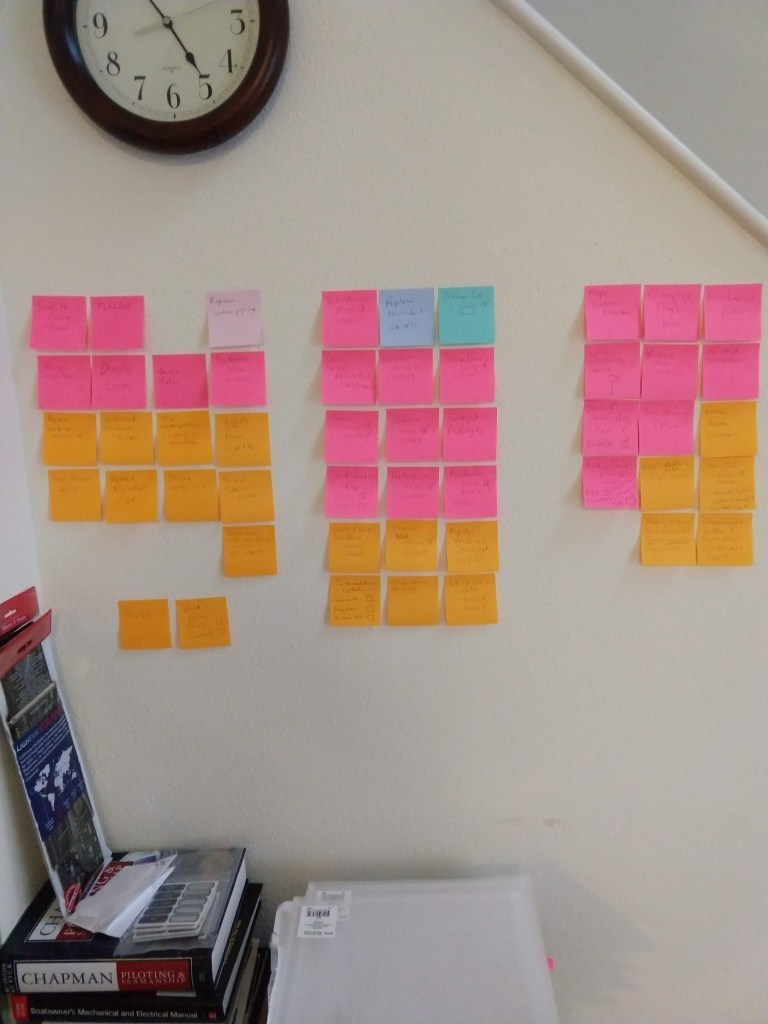 I have lists of tasks, notes, pictures, numbers and details. Kelly focuses on the budget and I deal with the technical details. We both work on logistics and order lots of parts, receiving almost daily shipments from Amazon and various chandleries. She and I work together well on the boat, and at our apartment – a well-oiled machine, each helping one another to get all this stuff completed. We keep track of most details using hand-written lists and spreadsheets on Google Docs. I keep a tape measure and notebook (carried with me almost constantly) containing many sketches, measurements, part numbers, contact details, etc. But, one of our primary tracking tools is a series of Post-It Notes, on a prominent wall at our apartment.