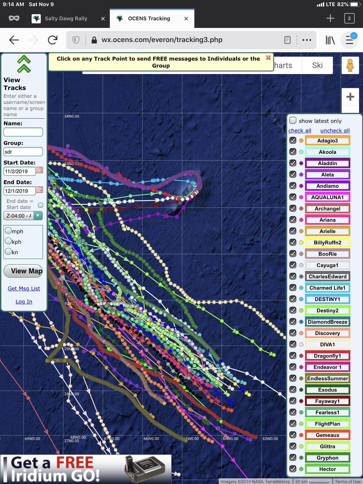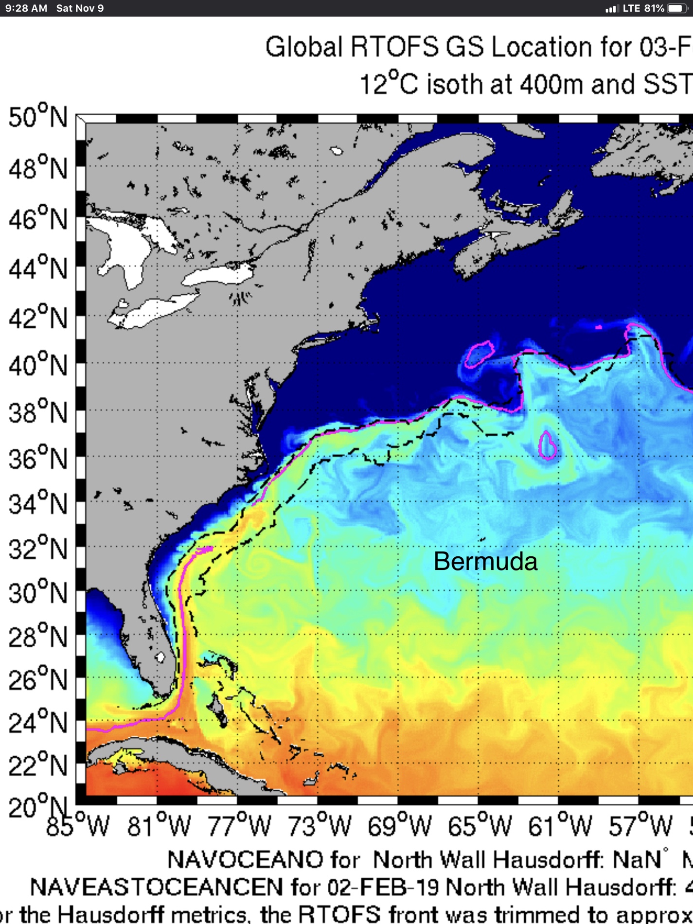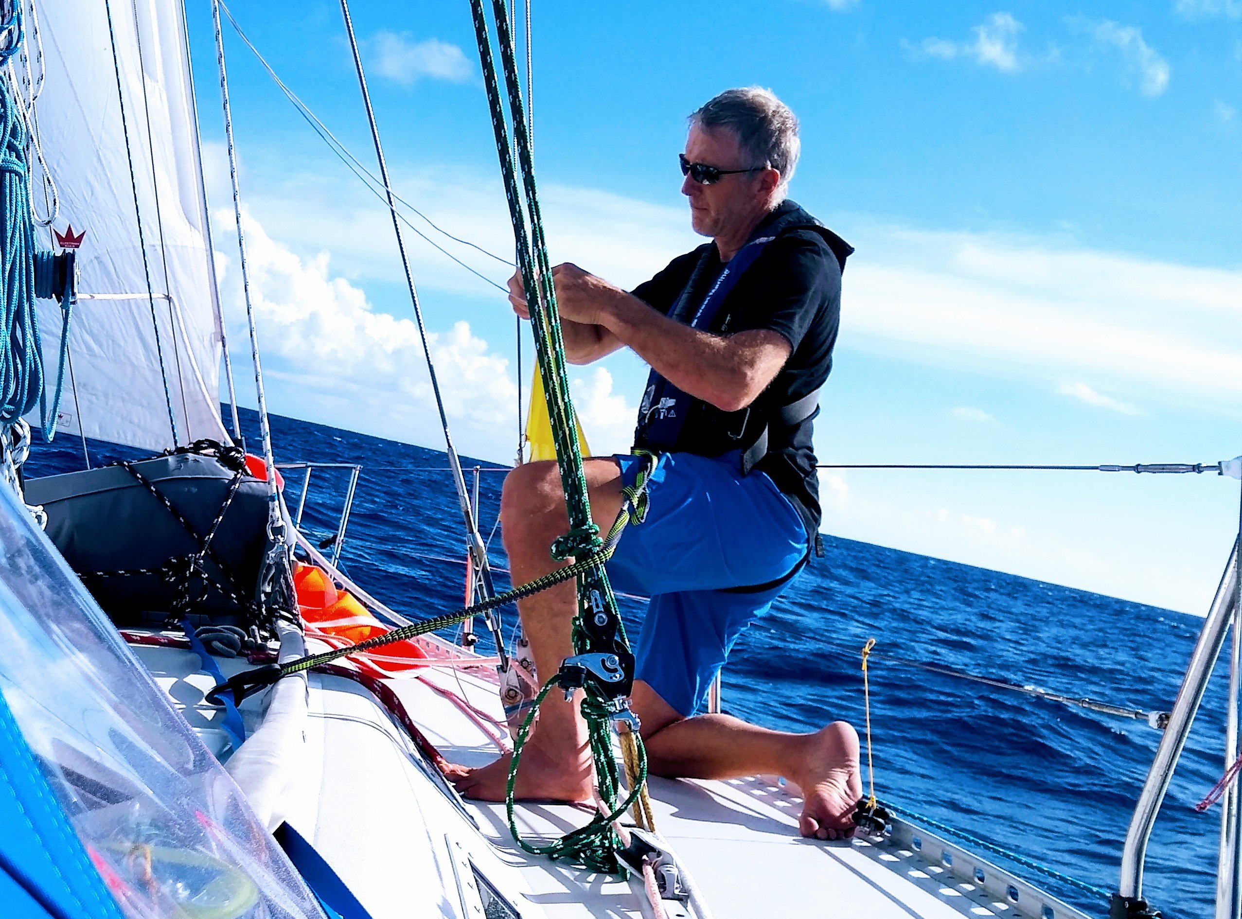 Traveling along a generally SE path toward our destination, each day we’d read updates from our weather-routing service, dealing with motoring when calm, and of course sailing whenever possible. However, even with current conditions at our location being favorable, by Tuesday we received a report describing deteriorating conditions should we not reach a point 28 deg N and 64 deg W by Saturday morning. By our calculations this goal would be doable but difficult, as we were a bit further behind most vessels in our Salty Dawgs group. We had purposely stalled earlier in the week, based on the weatherman’s advice, allowing us to save fuel and wait for upcoming favorable wind. But even after getting our promised wind, a bout of gale-force overnight squalls on Wednesday left us seriously considering stopping off in Bermuda again.