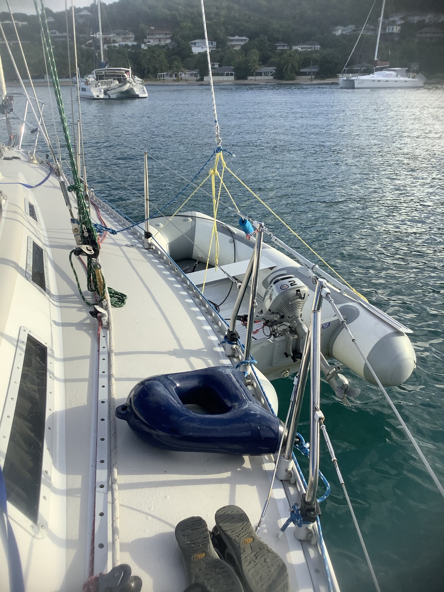 We began this typical morning after having a somewhat fitful evening of loud music (from a nearby club ’til 0100), strong wind gusts and heavy rain squalls through our anchorage in Freeman’s Bay, Antigua. Fayaway rocks around a bit with some gusts (this is ok), but sometimes we’re rudely awakened by rain blowing down through the open hatch, and so it takes just a few seconds to realize we must quickly chock the hatches closed else be soaked. Fortunately we haven’t received more than a few light sprayings, as the strong wind first gives enough warning. The rain stops just as quickly, prompting another reopening of the hatches. Temperatures throughout this process varies by only a few comfortable degrees (78-82F).