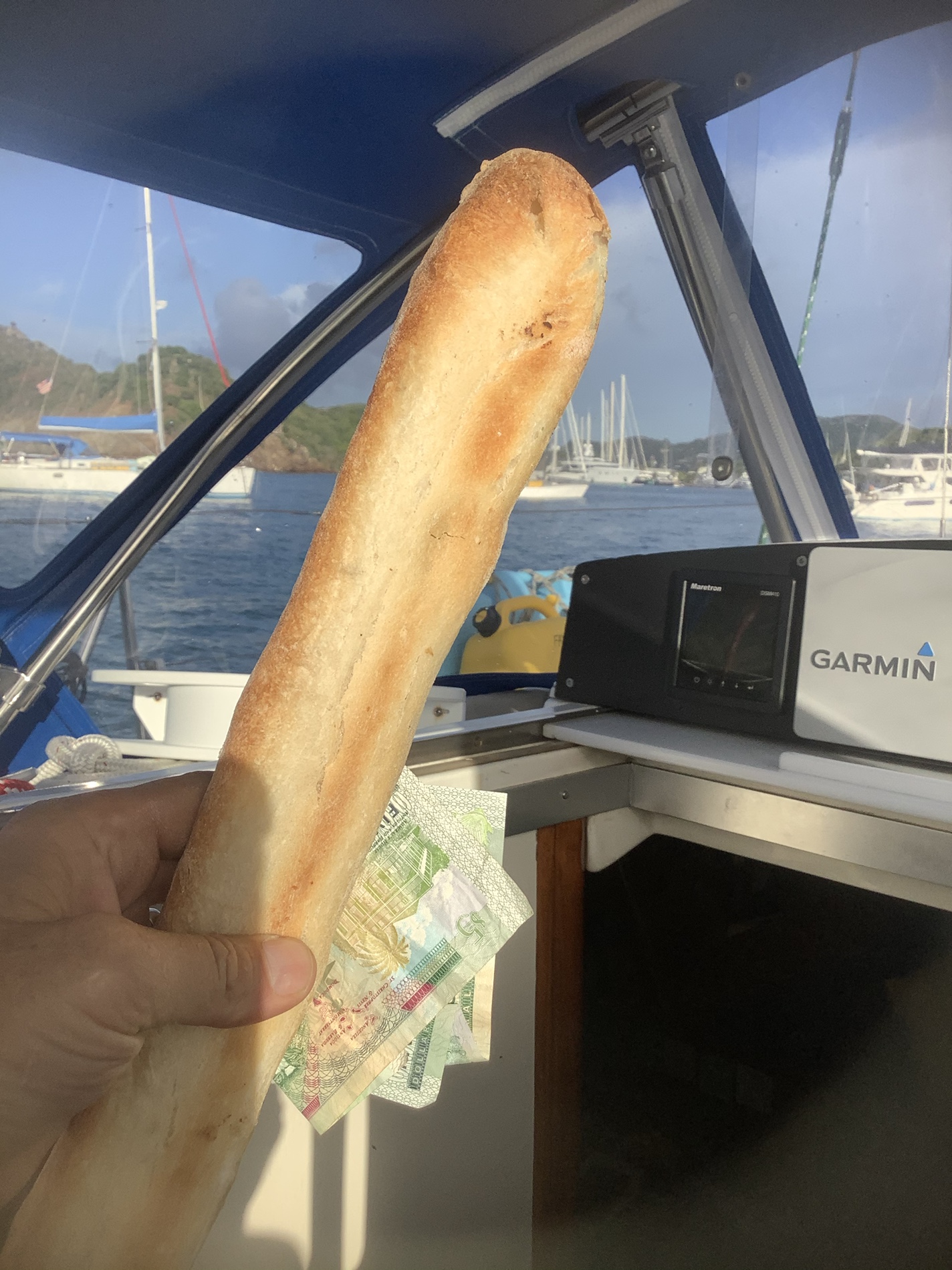 Today I made banana bread for breakfast because we had too many ripe bananas (other days we eat yogurt with museli, or flag the croissant dude over for croissants au chocolat). After another cup of coffee, and more liesurely watching, listening and reading I lower and bring alongside KoryKory for a ride to Nelson’s Dockyard. We dump a small bag of garbage in the nearby disposal area near the dinghy dock.