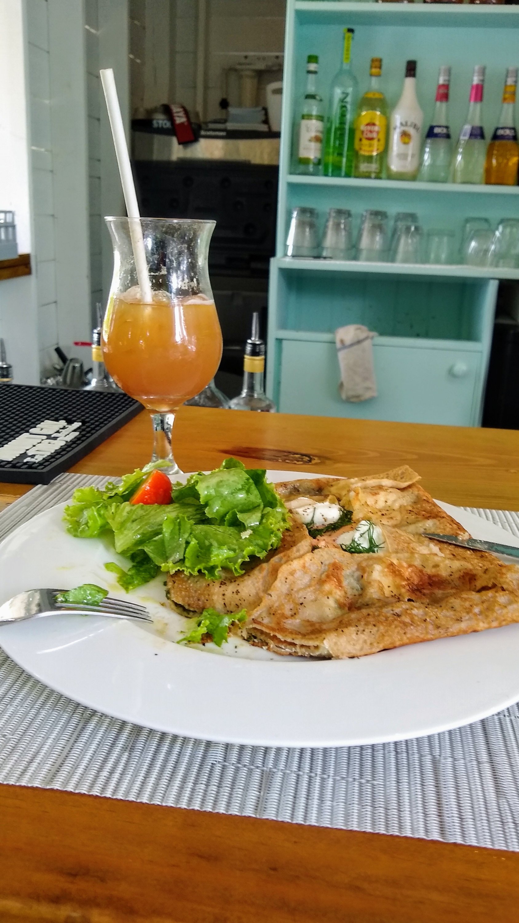 After paying for the coffee, we decide to walk about a half mile to a highly-regarded restaurant in Falmouth – Colibri. We received a hearty greeting from Karen who is working the lunchtime bar area. I ask, “what’s good today!?” She answers by mixing for us an unusual rum cocktail using homemade ginger beer and tamarind. (Hey, it’s after 1200!) Kelly orders a vegetarian crepe and I a Norwegian crepe. Scrumptious. We pay and say to ourselves again, “now what?” Undecidedly, we roam around the shops in Falmouth for a while before deciding to turn back toward English Harbor.