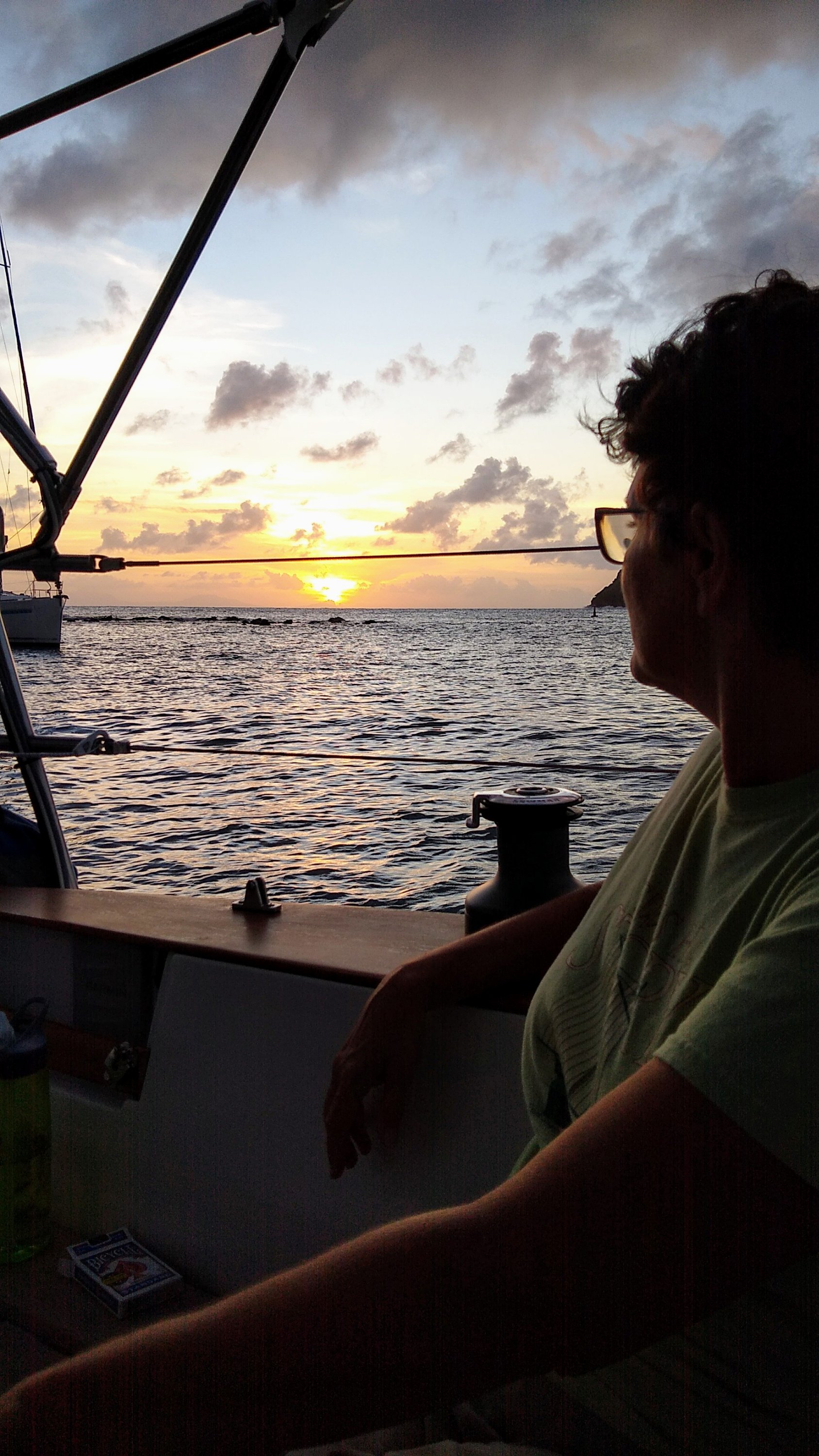Eventually it is close enough to 1600, so we walk back to the laundry and pick up the neatly folded clothes, pleased that they are also in a large plastic bag because we are still under threat of squalls. Along our way back to the dock we stop by Nelson’s Dockyard Bakery for a couple meat pastries to-go. Finally, we get to KoryKory, unlock and motor back to Fayaway at the far end of the harbor. We climb aboard, settle in and play two games of cribbage while watching the sun. We notice two new neighbors (charter boats) and decide they are anchored safely distant to avoid bumping us during the night. I make a call to my mother to wish her a happy birthday. We wrap up by eating the meat pastries with a glass of wine.