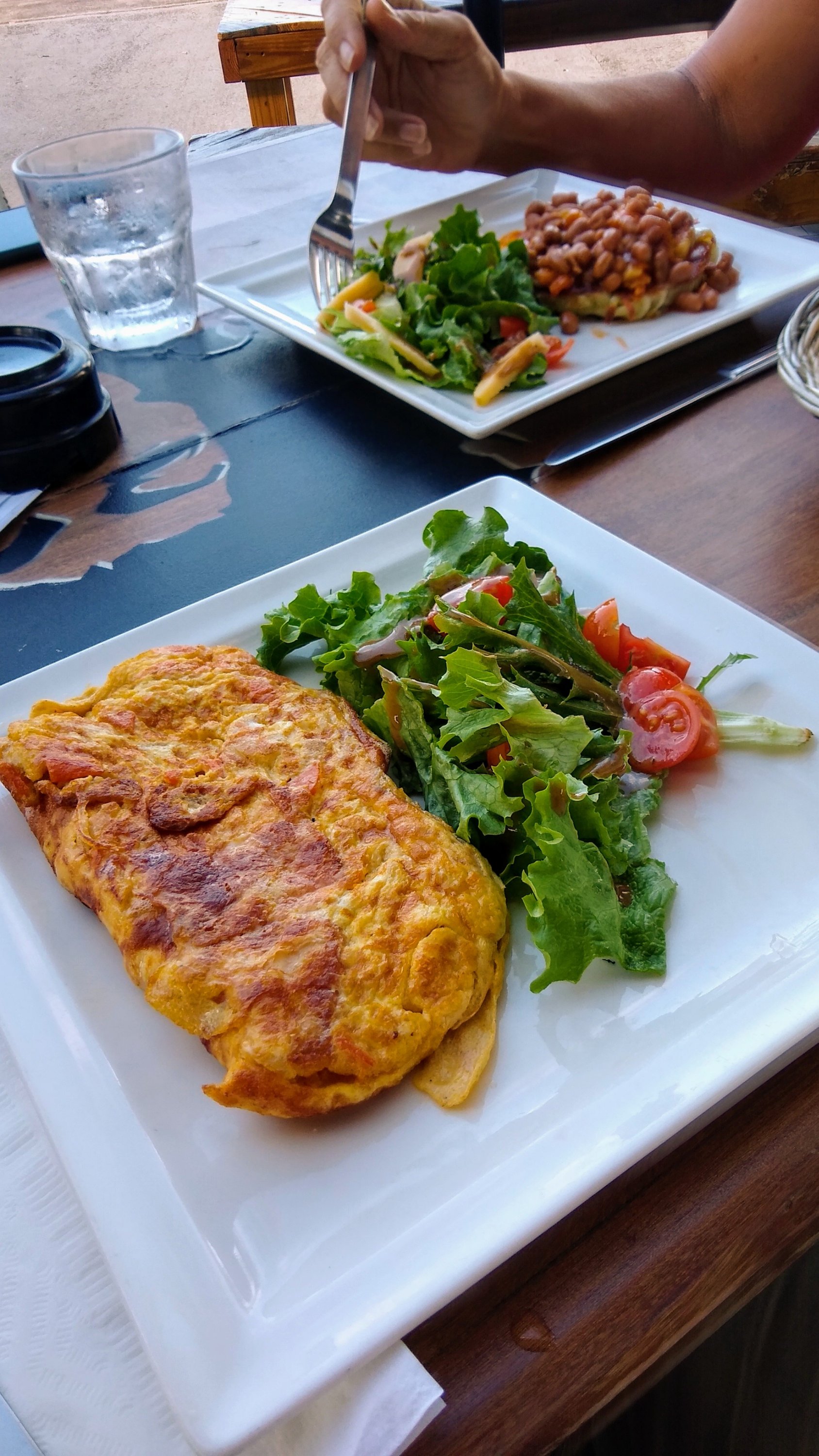 Temptation for great food and drink is taking its toll on the occupants of Fayaway. After the first week we dinghied around Simpson Bay trying various restaurants, and found a few pretty good ones too! But then the business of increasing wind making for a brisk salty ride, pushed us back toward the laziness of walking barefoot to our nearby favorite Lagoonies. Not an ad for this restaurant, but I must say their friendly staff has made their menu too tempting to refuse. And so we’ve been finding ourselves eating here for at least one meal every day. We know the staff well. Jimmy, Marley, Deanna and others know us well, and don’t bother asking as we approach for daily Happy Hour. (Dos Presidentés, por favor.) We just sit at a table and cold beer appears! While their burgers are the worst, their otherwise eclectic and changing menu of mostly exotic vegetarian and vegan dishes, washed down with local fresh beer are difficult to refuse.