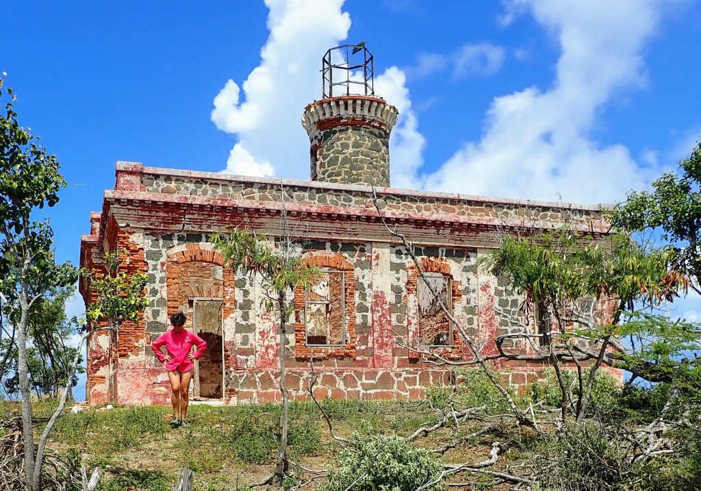 Eventually we made it all the way to the top of the 305 foot hill and encountered the lighthouse. The backstory is: it’s the only remaining Spanish-era structure in the Culebra archipelago. Built between 1882 and 1886, it guided ships through the Virgin Passage and the Vieques Sound. It was the oldest operating lighthouse in the Caribbean until 1975 when it was replaced by the US Coast Guard with a solar powered beacon. The original structure has since fallen into disrepair, but there are signs that an attempt was made to rehab the building or at least arrest its disintegration.