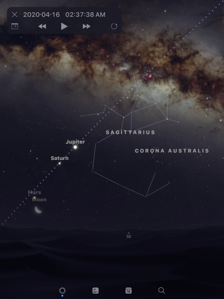 Last night I awoke from some minor disturbance – possibly a fish jumping, heard outside our open hatch. Spying the clear starriness, I couldn’t help but to get up and go for a walk outside. (not very far you know). And I’m glad I did, for it was just before our orangy crescent moon arose from the southeast. Just above those low hills were Jupiter, Saturn and Mars, as though being pulled up on the same invisible string by Sagittarius, rising upward from the brightening horizon. Incredible! Whilst awaiting for the moonrise finale, I gandered toward my right. There so clearly was Scorpio, with its head Antares gleaming brilliantly, spreading the scorpion’s claws outward. I went briefly below to get my binoculars for hope of seeing something even more. (But they weren’t necessary or helpful.) As I’m still shaking off chills of amazement, I notice a bit more toward the south was glaring the closest of them all, Alpha Centauri, saying hello from Centaurus. (A mere 4.3 light years away). In my excitement, I couldn’t help but to wake Kelly, inviting her for our personal show outside. She was not disappointed!