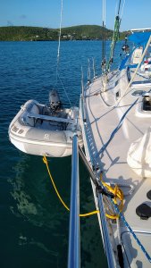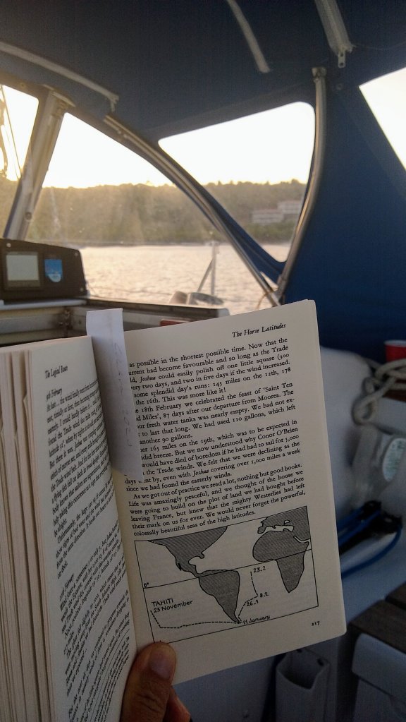 Earlier in the day we talked about venturing to land for replenishment of supplies, and I had prepared our ride by lowering Korykory into the water, and entertaining myself with a bit of outboard motor maintenance. I accomplished cleaning the spark plugs, but our minds were quickly changed again with the arrival of a few passing rain squalls. Nice how quickly they cool and rinse off any notion of us going ashore. We don’t need food now, but it would be nice to have some fresh vegetables. We still have one fat green pepper for the stir-fry tonight. Like the last quarter of our moon, I raise Korykory out of the water for the evening. He gives me a bit of fuss because he’s captured quite a bit of water. So, I open the plug and give another few cranks on the halyard. Good night, Korykory! We’ll go out and play tomorrow.