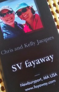 Enter boat cards. Like the calling cards of the Victorian era, they announce the the name of the person with whom we visited. And provide a lasting cheat-sheet for us. We have amassed a fair number of these reminders and have referred to them as we see a familiar boat as we (or they) enter a new anchorage. Ah, yes! It’s Doug and Mary on Zipporah! They taught us to play Farkle in Antigua.
