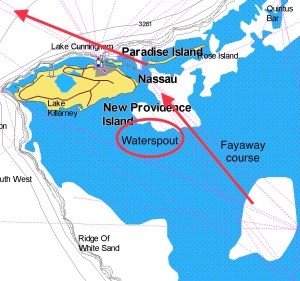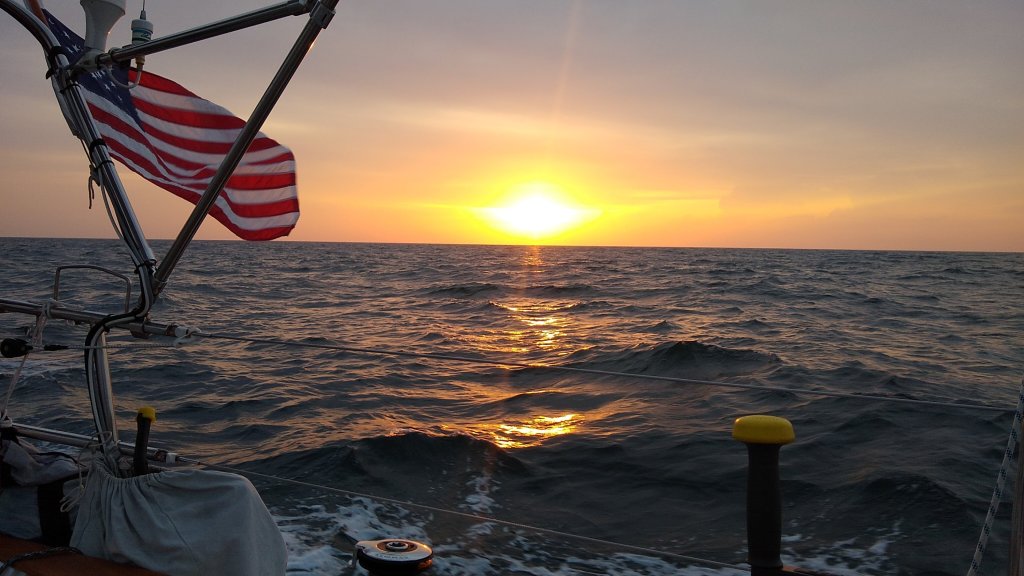 As with the Merrimack mouth, my principal concern is the shallow depth – large swells mean also deep troughs. Would we hit bottom?! Fortunately again, we did not. Upon reaching the relatively comfortable point of open water and typical 7 foot waves with 20 knot following breezes, we hoisted an appropriate amount of Dacron and prepared for another evening offshore, rounding north of the Berry Islands, on route toward Grand Bahama.