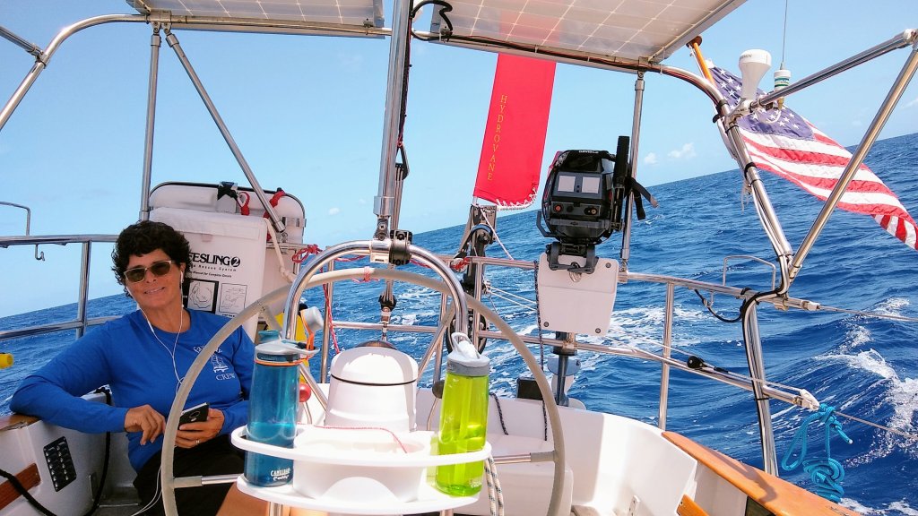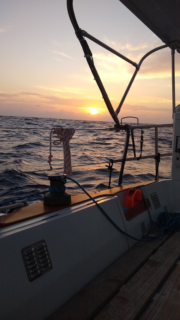 Later that morning we completely dropped the main, and poled out the genoa, which helped smooth our ride, but kept plenty of speed. I seriously burned my legs with scalding water, trying to make coffee and feed my addictions. (Maybe I drink too much?) Note to self: The safest way to make coffee while in a rolling sea is to use three hands. Watched the new Blade Runner “2049” after dinner.