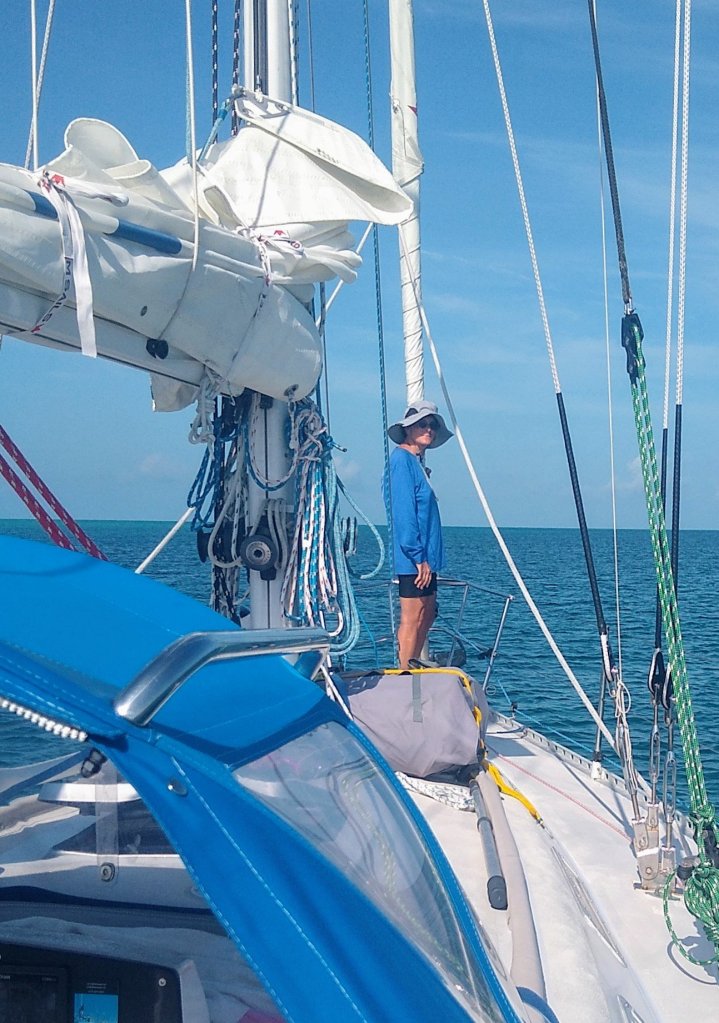 Early morning brings a return of clear sky and brisk following wind. So we continue NW, up through the Bahamas. Since we’re only allowed “safe passage” and not allowed to land, the captain thinks it prudent to hoist the Q and Bahamas courtesy flags.