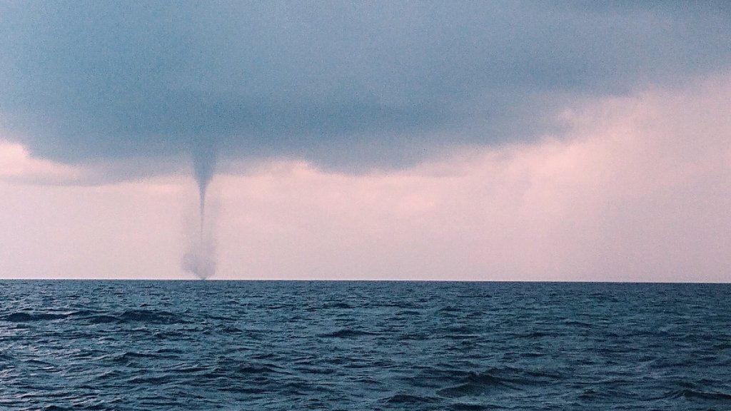 Seeing and being close enough to hear the growling roar of a real waterspout was exciting enough for that day, but we weren’t done. Fortunately, the sky parted just enough to let us squeak through a passage between Porgee Rocks and Rose Island. We exhaled a sigh of relief after passing through the coral bommie minefields, before our friendly sun began dropping toward our direction. However, we had another surprise…