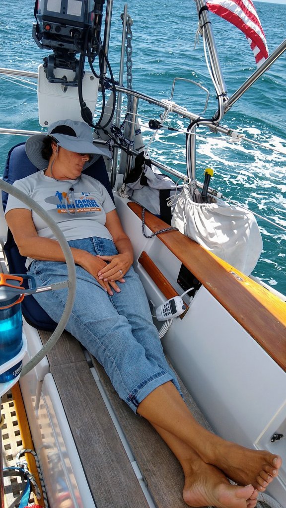 Ever tried to enter the mouth of the Merrimack River on a fast outgoing tide combined with a 30 knot easterly wind? Well you still haven’t seen anything compared to what it took for us to claw our way out from Hanover Sound. Evidently, growing swells (leftovers from Alberto) had been groomed by brisk northeasterly wind into this funnel from which we barely emerged. Sorry- no pics, as I was swinging our wheel fervently as our little 3-cylinder diesel strained to keep us pointing into the (guessing 30+ foot) breaking wall of water. Have you seen Finest Hours? Well, of course not quite that dramatic, but certainly enough to pucker our innards for a tad.