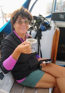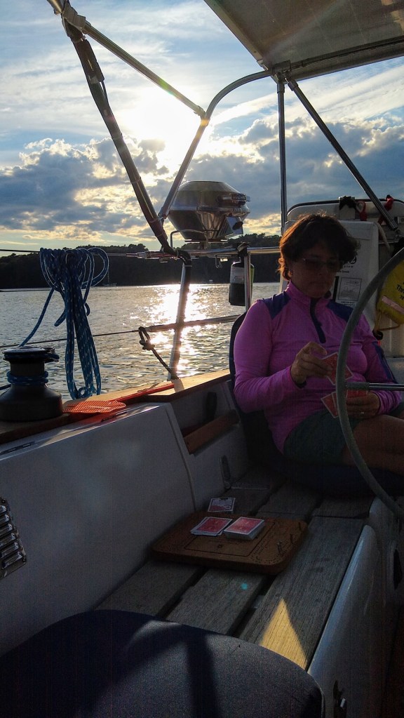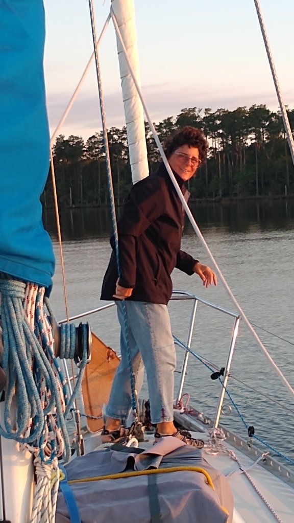 Through experience (not without flared tempers), anchoring has reached the point of being uncontroversial. As we slowly approach a previously discussed spot, Kelly walks to the bow, armed with knowledge of the depth, and thereby how much chain to drop initially. I’ll try to time our approach as she removes the securing pin and loosens the anchor on the roller, then looking back to watch for my signal. I give a thumbs down, indicating to drop now, as the boat stops. We let the boat drift back with the wind, often with bow falling away faster. We know the feeling of when the anchor catches. I know how much throttle (or how little) to apply, while Kelly knows how fast to let chain out as we drift back. If weedy, I’ll let it settle in more slowly. If mud or sand I may gently apply more backwards throttle. This method seems to work for us. Retrieval is another easily communicated routine. Once in Provincetown harbor (Cape Cod, USA) I recall getting fouled on a piece of ancient fishing gear- I quickly ran forward with a knife to cut the offending net away as we drifted toward another boat. Disaster avoided!