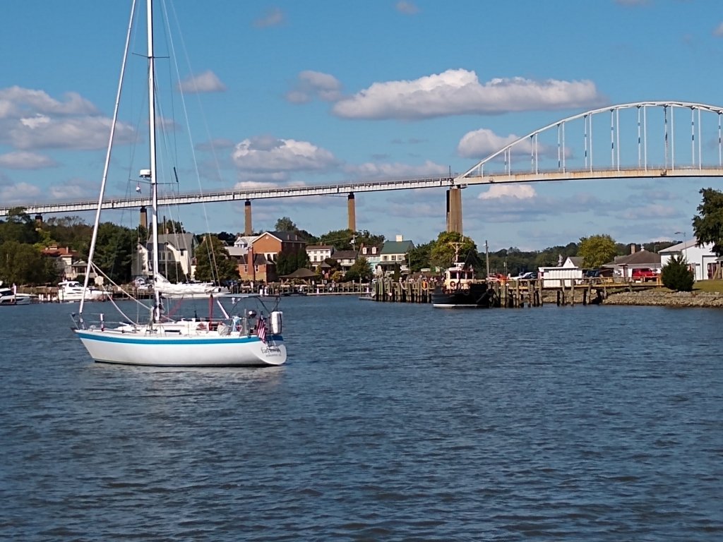 I’ll fast-forward a bit here, and give that the remaining passage north was as usual, an adventure, passing through rural woodlands, under (and through) many bridges, and a set of canal locks, to eventually pop out into the Chesapeake Bay at Norfolk. Seriously, we’re so happy any time that we’re aboard and underway. We are entertained and challenged by big and small. We joked about a really cool guy we’d seen a few times following our path, wearing what looked like a diaper (was probably a poorly fitted Speedo, and difficult now to erase from memory). Landfall occurred only once – for food and fuel, but we weren’t deprived. One small mishap occurred when a truly negligent sailor struck us hard broadside (while we were anchored and playing cribbage during happy hour in Weems Creek, Annapolis; but that’s a nice story in itself for another day!).