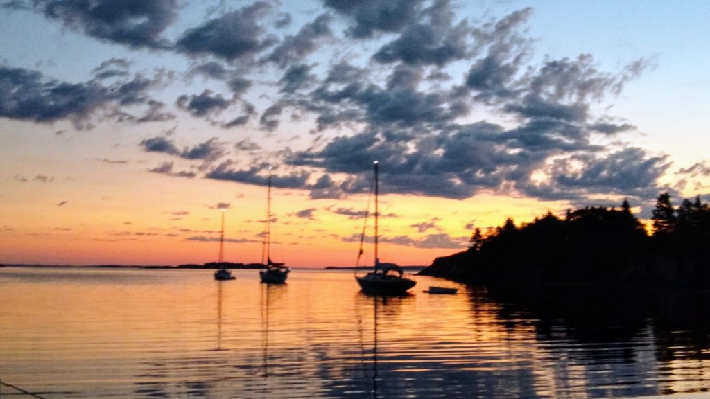 Southwest wind (15 to 20 knots; perfect) was predicted for the next evening. Arriving on a weekday, early in the afternoon should give us additional confidence that any popular anchorage won’t be too packed with boats for us to drop at an optimal spot. During the few hours before our approach, we considered contingencies around Great Chebeague or maybe one of the other little islands just north or Portland. Maybe we take a mooring on the SW side of Cliff Island, graciously offered by a friend? We first approached the north side of Jewell Island. Seeing only a few boats anchored as we drew near, we entered the little Cocktail Cove inlet and dropped the hook about halfway into this mini sound, giving plenty of space to swing between two other Maine-area vacationing cruisers. Aahhh… paradise again. What a beautiful place indeed! Break out the happy hour 🙂