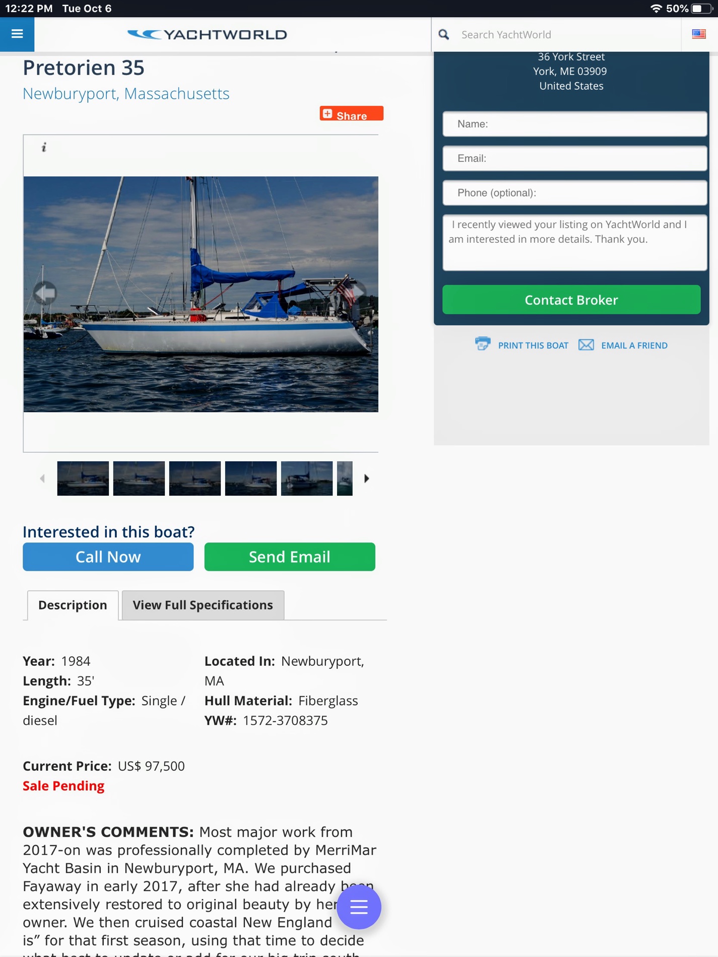 8/30/20 – One day. That’s the amount of time elapsed after the listing went public on Yacht world. A first offer was received (and rejected). 25% below asking price. Can’t blame him for trying to buy a dream boat with all his savings.