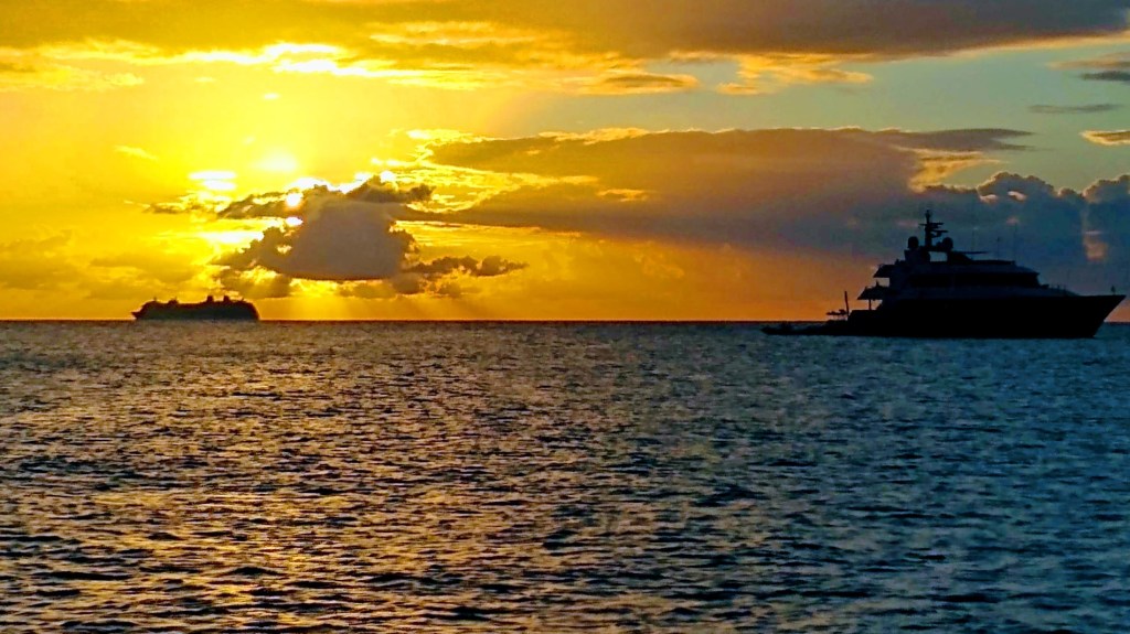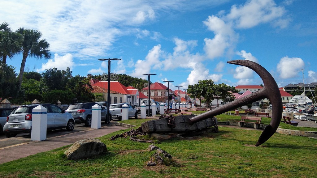 Simpson Bay, Dutch Sint Maarten was only a day or so to the NNW, from St Kitts, and so we set sail on New Year’s Day (2020), just as the sun was rising in our faces as we rounded the SE tip of St Kitts, and then turned north between St Kitts and Nevis toward the open comfort of deeper blue water. Along the way to Sint Maarten, we decided to stop at another island, anchoring just outside of Gustavia, St. Barthelemy, also known as St Barts. I blogged about it here. Yes, another wonderful place, and definitely exciting if you happen to visit during the holidays!