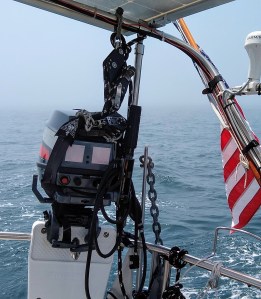 And we became happy with the choice we made. I recycled our spare boom vang blocks, and hung them with a homemade dyneema soft shackle from the Bimini/solar frame to create a hoist.