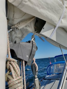 Poking my head above the companionway to assess things outside, I saw that Gordon was hand-steering, and he explained that the reef line had broken at the clew. Looking up, I could see that the sail was billowing out and luffing, catching more of the 20 knots of wind than we’d prefer. I eased the sheet, dropped the sail a bit, fed another piece of line into the grommet and pulled it to the boom end with a quick truckers hitch. Going forward on my tether, I also retied the tack with a hard bowline knot. Even if lines are in good condition (these were very tired) I’ve little patience with single-line reefing systems. Never have I found a system that works more to offset the frustration they give in return. Falling back off the wind, and squeezing in the main sheet, we regained speed before the 20 knot wind on a second reef, with mainsail once again nicely flattened.