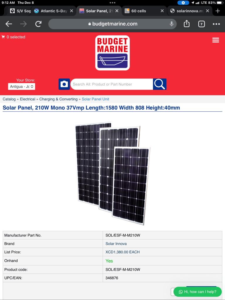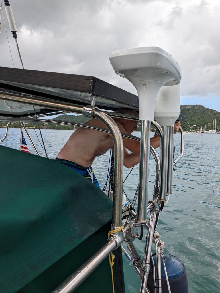 Soon after arriving in Antigua, we were meandering around the local Budget Marine store looking for one of those little (aka: easy to lose in the bilge) duck-bill anti-siphon doohickeys. On display were various solar panels, and all on-sale! Ok, the overactive mind gears start grinding, and the mental picture stuck for later back on Fayaway.