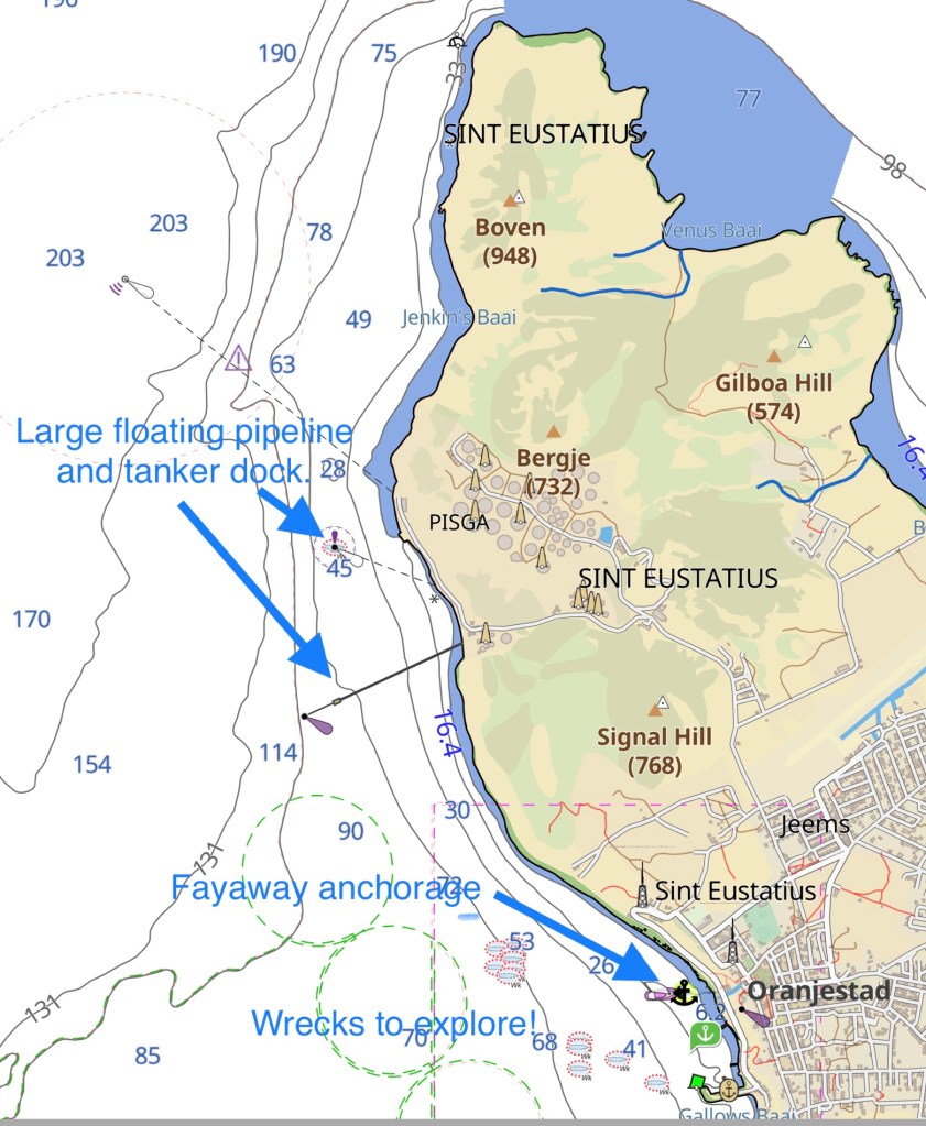 Our Doyle guidebook notes that Statia is home to a large bulk fuel storage facility. Hence explaining the large tank farm ashore, tankers and offshore piping facilities that we passed at a safe distance. This site explains how they handle more than 90 million barrels per year.