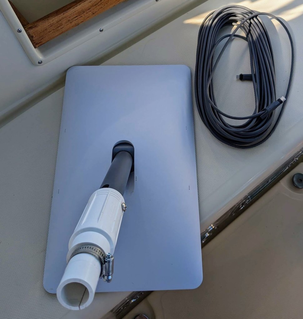 Elon’s ear came with a basic four-legged stand, which I initially strapped (with a sail-tie!) to various locations on deck. Of course he relentlessly complained about the “obstructed views” but still mostly fed us Amazon Prime well-enough. I was a bit concerned about theft at the time, as Elon could easily be kidnapped in the night. So, I routinely unplugged the cable at night at tucked him away down below. Then reversing the process the in the morning. Unfortunately, perhaps due in part to frequent rain squalls, a drop of water got in one day, and consequently shorted out at the connection point.