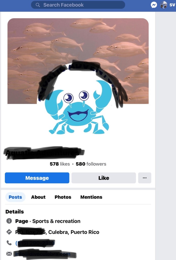 Hence, today’s tale: One of those small free tourist maps showing local services for the sunny island of Culebra had two dive shops indicated. Google, FaceBook and Trip Advisor revealed more details. One shop had a very professional website with online booking. Unfortunately, their soonest opening for a two-tank dive was more than two weeks away! The second shop doesn’t have a website, and only an outdated Facebook page, and relatively sparse information. We weren’t sure they were still in business!