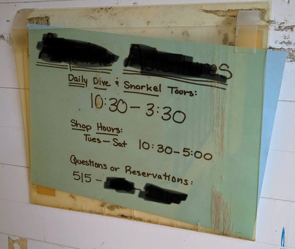 I inquired about the other dive shop in town. Another guy then appeared in the back doorway, in wetsuit regalia. Apparently overhearing, he added that he saw their competitor’s dive-boat “out on the water” that morning, so he knows “they’re in still business”. But both seemed a bit reluctant to neither endorse nor offer any additional opinion.