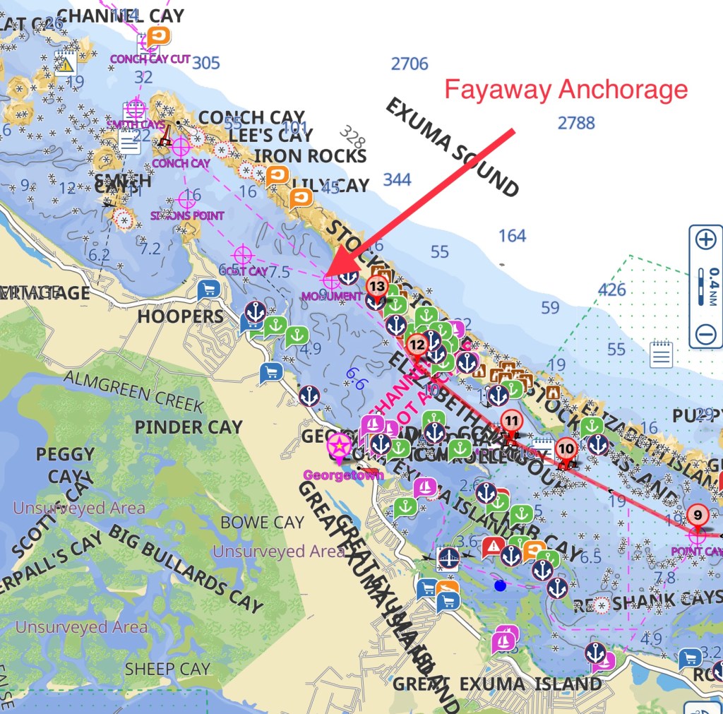 Early the next morning we motored out of Thompson Bay for points west, set up the whisker pole and made a leisurely downwind passage to Georgetown in the Exumas. Wow, we are really getting back to civilization now, as we had to anchor by squeezing between dozens of other vessels – all striving to stay out of the busy channel between Great Exuma and Stocking Island.
