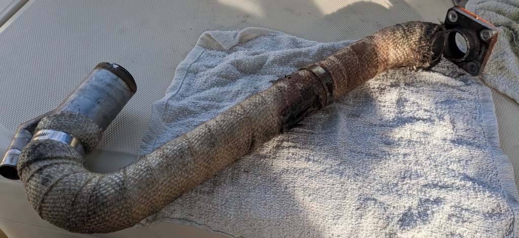 Later on that day our engine failed – sort of: The motor ran but a welded elbow section of exhaust manifold separated, spewing scorching sooty fumes into the engine compartment, into our breathing space and most seriously, potentially could have soon flooded the boat with raw salty water.