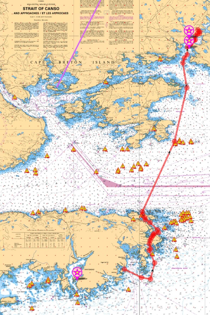Throughout a dense-fog morning, meandering the inside route from Louse Harbour, past Andrew, Piscataqui and George Islands, the gloomy thickness lifted just as we approached Canso to port. Then we opened up the genny catching the prevalent SW breeze for a NNE run out and across the shipping lanes entering the Straight of Canso with 3 foot seas and a joyous 15 knots filling our genoa.