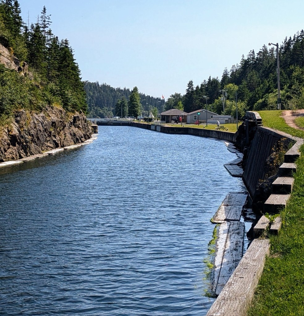 Pre-canal, the location was a popular portage road, where cargo was unloaded, carted and then reloaded onto a second waiting ship. Construction of the St Peters Canal was started in 1854, as a shortcut through the protected Bras D’Or lakes from the south (northern end is open to the ocean). After 15 years of cutting, blasting and drilling through solid rock, a tidal lock was finally installed in 1869. The tidal range is a barely greater than two feet. Why locks? One side or the other can be higher depending on the time, making for a nasty current.