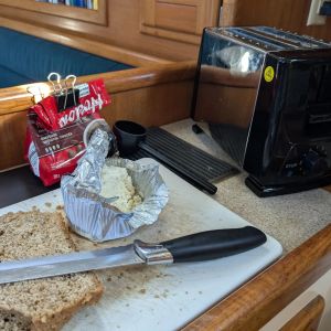 Lunchtime over now, what to do? Perhaps a nap or a book? Nah, I keep going with little projects, such as measuring and splicing eyes into dyneema lines for shore-tie-ups. One of those things you hope you don’t need, but our adventures could indeed find some future need.!