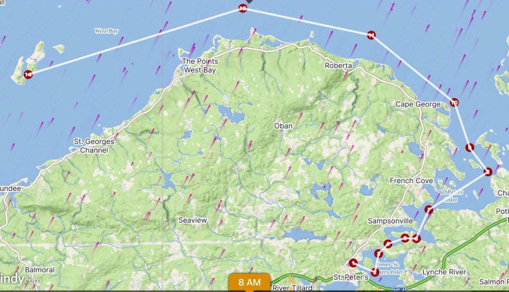 So now we kick off our long sought after adventure… Our big plan on a larger time scale: Since prevailing winds are SW, and their strength a diurnal pattern (increasing into afternoon and decreasing into evening), we’ll take this morning’s reprieve to head out of the St Peters area and initially into West Bay (against lighter prevailing wind), then work NE eventually making our way up St Andrew’s Channel. Late August cooler weather will make it known that it’s time to head south again. At least that’s the plan made in the sand at low tide.