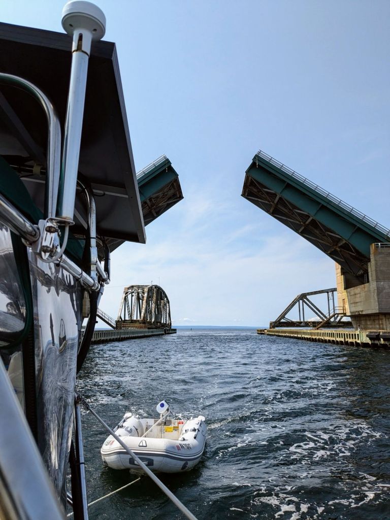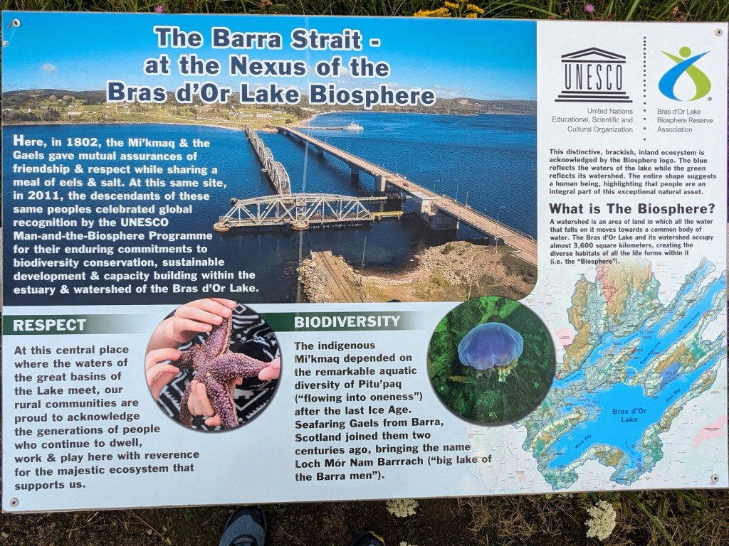 So, just to keep things sorted, now in 2024, the Grand Narrows Bridge is now defunct and so is permanently open. It is the newer double-bascule Barra Strait bridge that opens for us weary sailboats. (We’ll return again heading south through this area, in a later post, anchoring just around the corner in the “port” of Iona.)