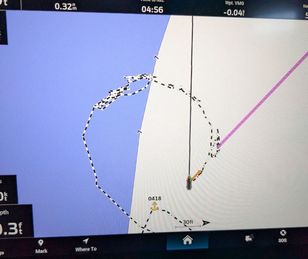 Several evenings in a row were anchored in beautiful seaside spots. Once again when first dropping the hook, we’re appropriately facing SW, as approaching thunderstorms loom in the west. And after the nasty dark storm clouds pass, dumping a meager wetness, we spin a three-sixty by morning.