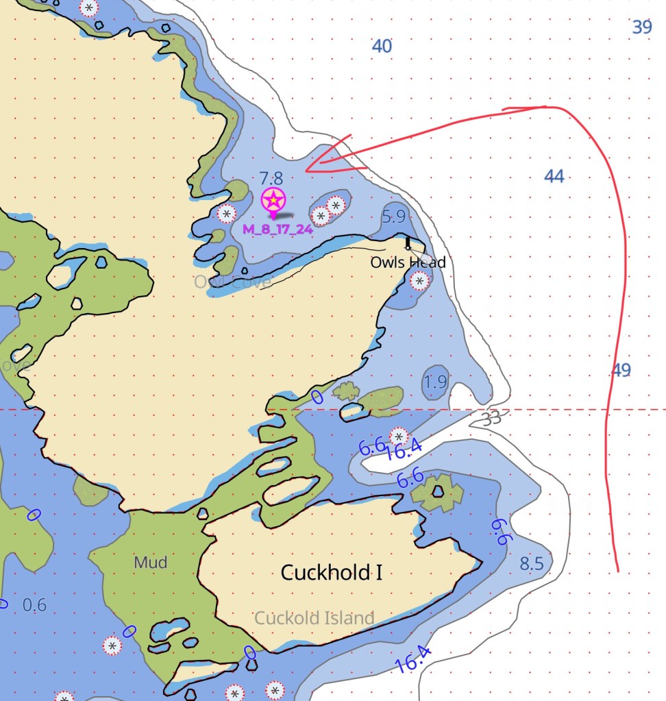 Given the predicted benign conditions overnight: diminishing mild southern breeze, almost no swell and partly sunny skies, we made a short stopover at a tiny nook just inside of Owl’s Head. Scattered thunderstorms surrounding us, but none too threatening. I instinctively put the iPad into the oven, just in case!