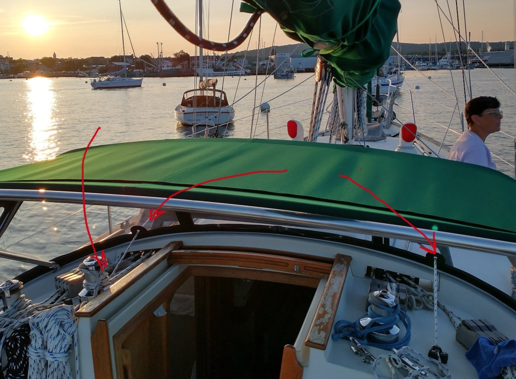 Highlight on left indicates fourth “stabilizing“ line attachment to keep boom from swinging while not underway. Highlight to right shows one of two holes through new dodger window .