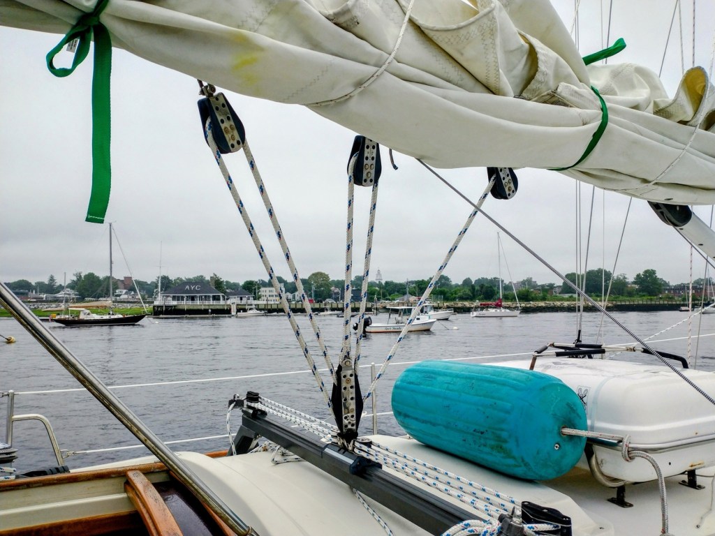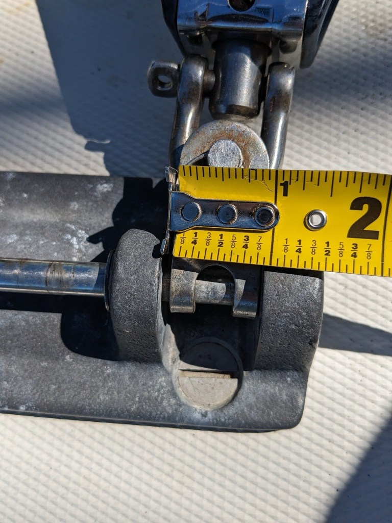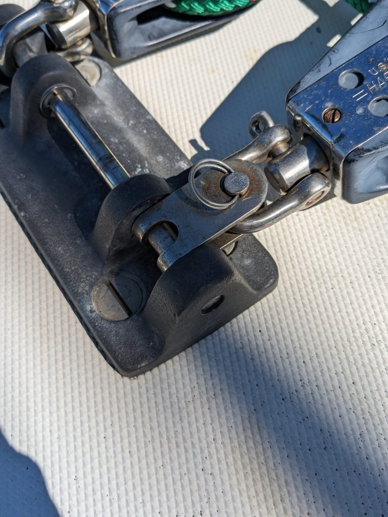 Not to belabor this topic, a corollary modification was to reduce boom twist (torsional force on gooseneck) by adding bales to replace the bottom attachment points. Running short on time before launch I asked the local rigger to find and add three large bales, for which to attach the boom blocks. However, because the new bales aren’t rounded, only narrowing to a lower point, they do nothing to solve the problem of boom twist, and are now left unused. (Note for future: triple-confirm to rigger that he understands what you want).