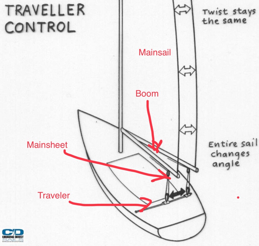 Cutting through the jargon: A traveler is boat-speak for a track-mounted device used to adjust mainsail shape, essentially improving its efficiency under various conditions. A sheet is a line used to control a sail; and mainsheet connects the traveler to boom, which holds the foot and clew of the mainsail.