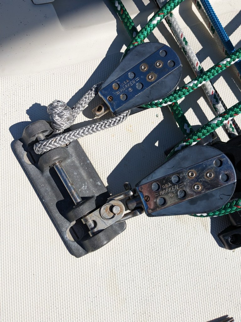 Next step: remove the old traveler. Harken makes these components to handle massive loads, and so I decided to keep and re-use the original supports for our new blocks.