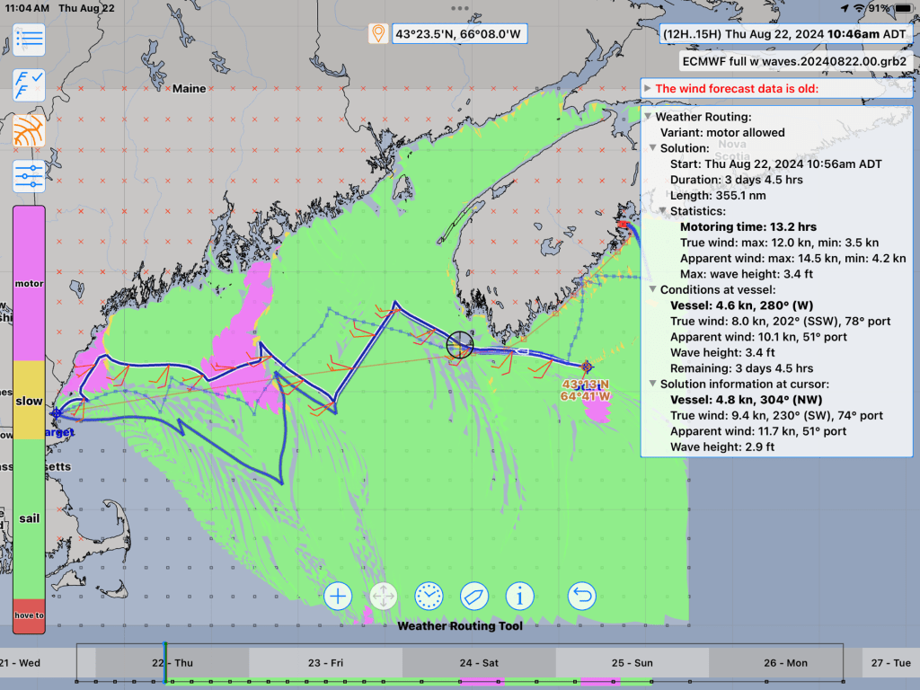 If you were now expecting a basic lesson on how to plan weather routing, or more details of how LuckGrib functions, you’ve come to the wrong page. I’m just figuring it all out myself. But I can say that I’ve tried a few others, and quickly gave up before getting nearly this far along. And I’ll likely keep using LuckGrib for future planning. That is, until something really magical comes along.