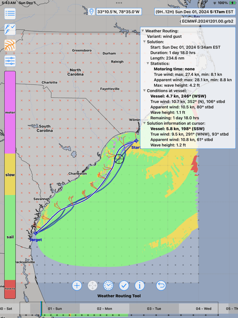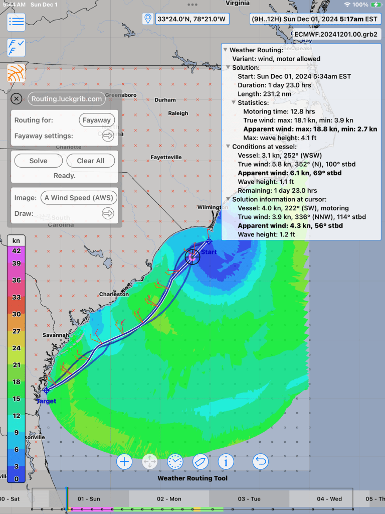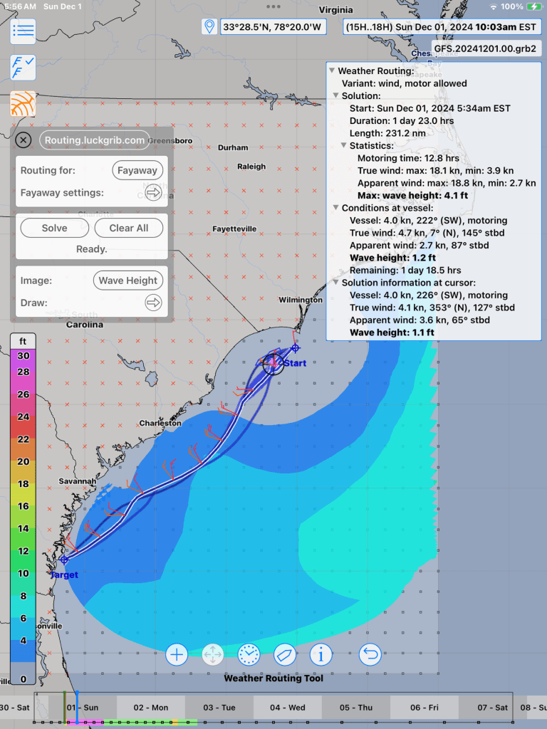 - Wave data can be downloaded and displayed, but it has no effect on the calculated passage timing or routing. I wrote to the developer to inquire, and he suggested using alternate polar inputs (LuckGib does easily allow – if I remember to use.) Using polars does make sense, thinking of it as simply a self-imposed de-rate). Anyway, it would be nice to have the routing calculation include on the fly.)