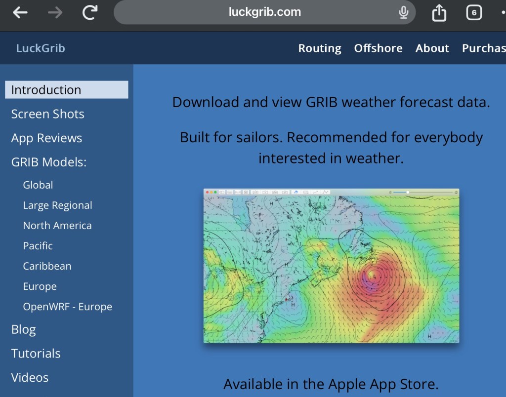 LuckGrib only works on Apple devices, which may turn off a few PC/Android-only folks. But I use my iPad almost continuously anyway for routine passage planning (see xxx post). This bit of kit starts out free with a trial period, with which I started fiddling last summer while bouncing up the coast of Nova Scotia. It didn’t take the full two-week trial to end before I sent them the minimal fee for a lifetime subscription. It’s that good.