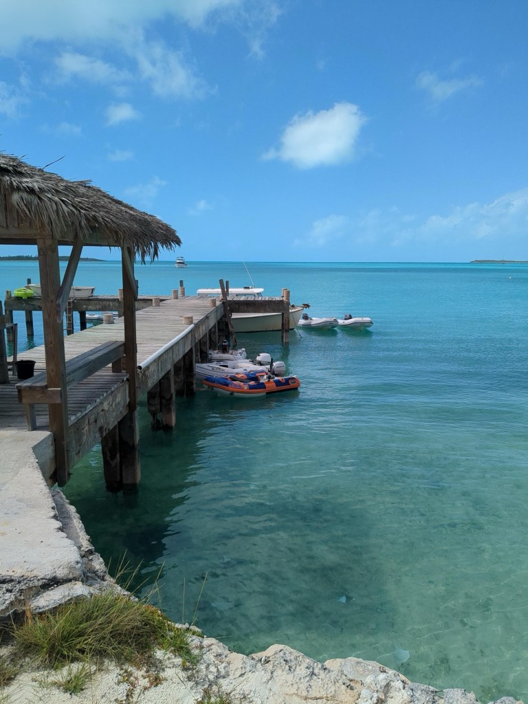 The next window for heading west toward Georgetown, Exumas left us one quiet day to kill. The next morning we dinghied across the bay for lunch at Tiny’s. However, Tiny’s cook was “out to lunch” that day. So we simply enjoyed a frosty beverage and chatted with a couple vacationing from New York.