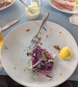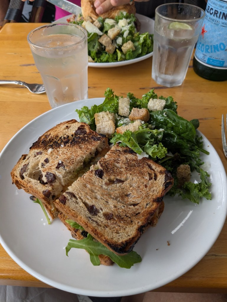 A sizable portion of (seems fresh) wahoo, house-made fresh and fragrant yeasty and “plumper raisin” bread. Thin slices of avocado, tomato, dark leafy greens, and a delicious house sauce (reddish of who-knows-what ingredients – possibly something spicy). Texture, taste and handling far outperform so far. Just the right combination of ingredients for moisture and hand-hold-ability. Top it off with green beacon of deliciousness: comes with a kale-based, lightly-dressed caesar salad. We’re going back here again! (And we did!)