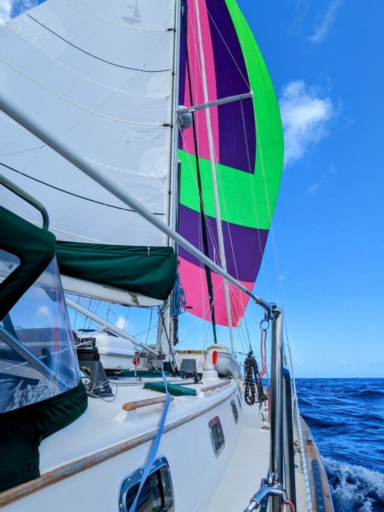 Offshore near the Exumas we had an awesome downwind run with our easy-to-use (and very colorful) asymmetrical.