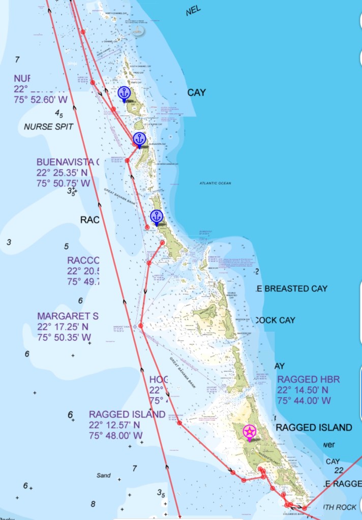 We had been in The Raggeds a remote Bahamian archipelago for close to three weeks at this point in mid February. Not so un-crowded and infrequently visited as in years past. While we usually look for anchorages less-traveled, we also truly enjoy social mixing with cruisers and locals alike. So, it we decided that we’d take a break from skinny-dipped sunsets, pull up the hook once again from our little piece of paradise and push a few miles south to where we know a popular anchorage is, and look for familiar faces and likely meet new ones too.